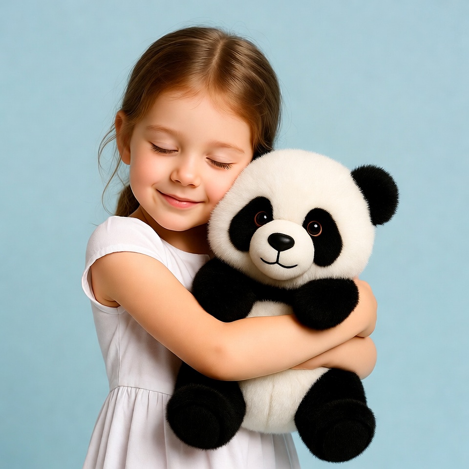 A young girl with brown hair smiles while hugging a plush panda teddy bear. She wears a white short-sleeved dress and stands against a light blue background. The panda bear has black and white fur with shiny black eyes.
