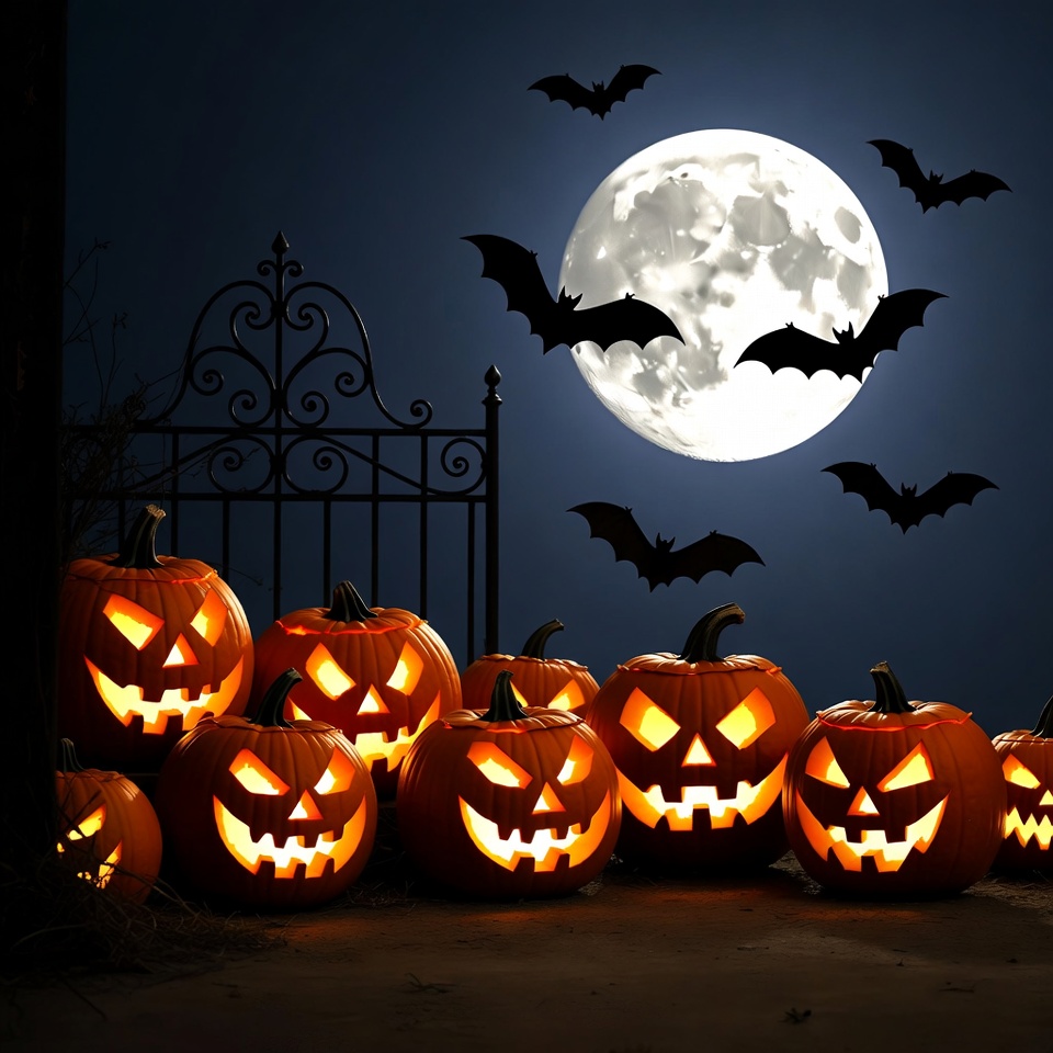 Multiple carved jack-o-lantern pumpkins with glowing orange faces sit in a group on the ground. A wrought iron gate stands behind them under a full moon in a dark night sky. Bats fly around the moon and scene, creating a Halloween atmosphere.