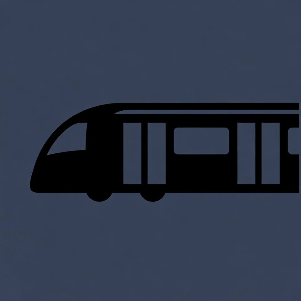 A black silhouette of a modern train is depicted on a dark blue background. The train features a streamlined body with multiple doors and windows. It is presented as a simple vector icon with clean lines.