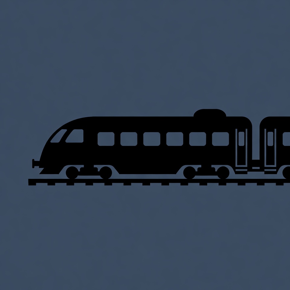 A black silhouette illustration of a streamlined passenger train with multiple cars travels along railroad tracks. The train features windows, a front engine, and wheels, set against a dark blue background. The image is a simple vector graphic with clean lines.