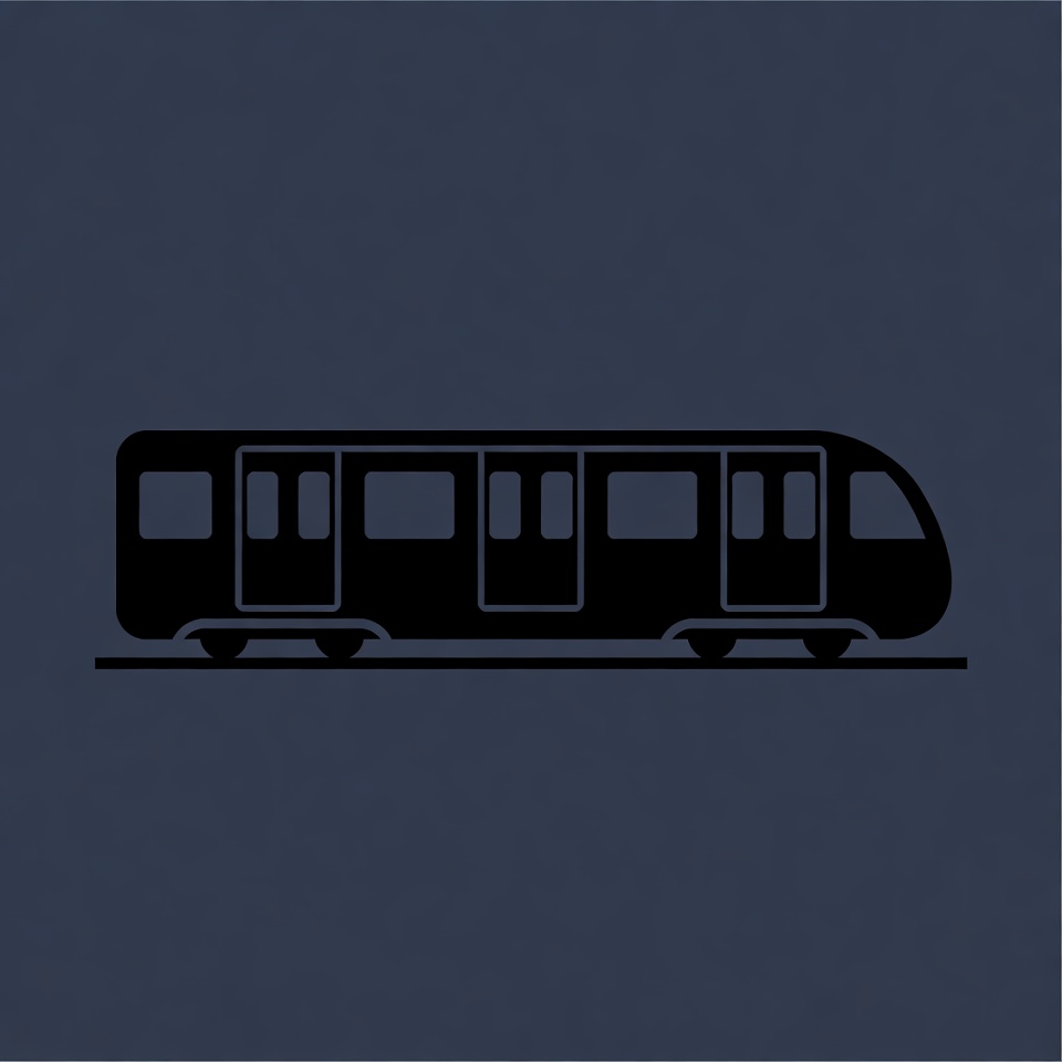 A sleek black silhouette of a modern train is depicted on a dark blue background. The train features multiple doors along its side and wheels beneath. It is a simple line art illustration isolated on a solid background.