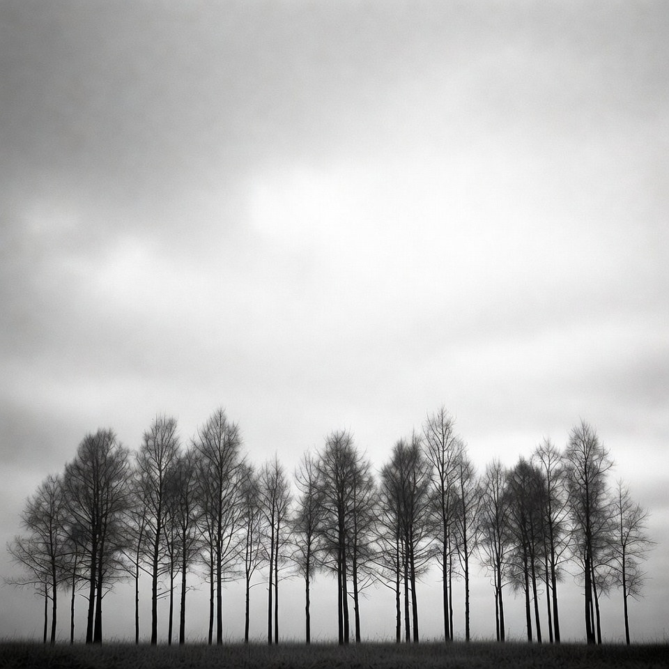 atmospheric, barren branches, black and white, cloudy sky, deciduous trees, foggy landscape, grass field, gray sky, horizon, landscape photography, monochrome, nature, outdoors, row of trees, silhouette, tall trees, tree line, winter trees, bare trees