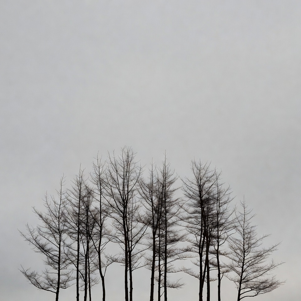 bare trees, branches, cloudy sky, dark outlines, gray sky, landscape, leafless trees, minimalism, nature, outdoors, silhouettes, tree trunks, twigs, winter trees, trees