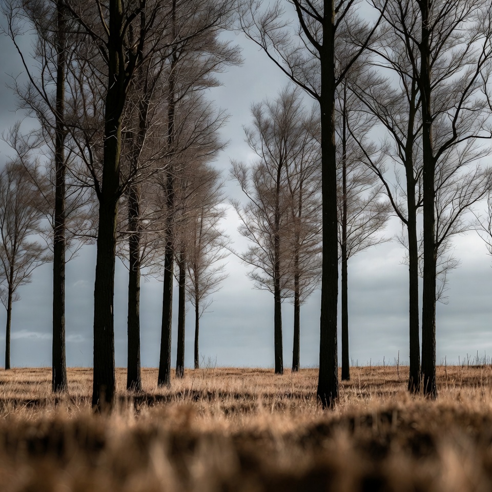 A straight row of tall, leafless trees stands in a dry, golden-brown field. The trees have dark trunks and sparse branches silhouetted against a cloudy sky. The foreground features blurred autumn grass.