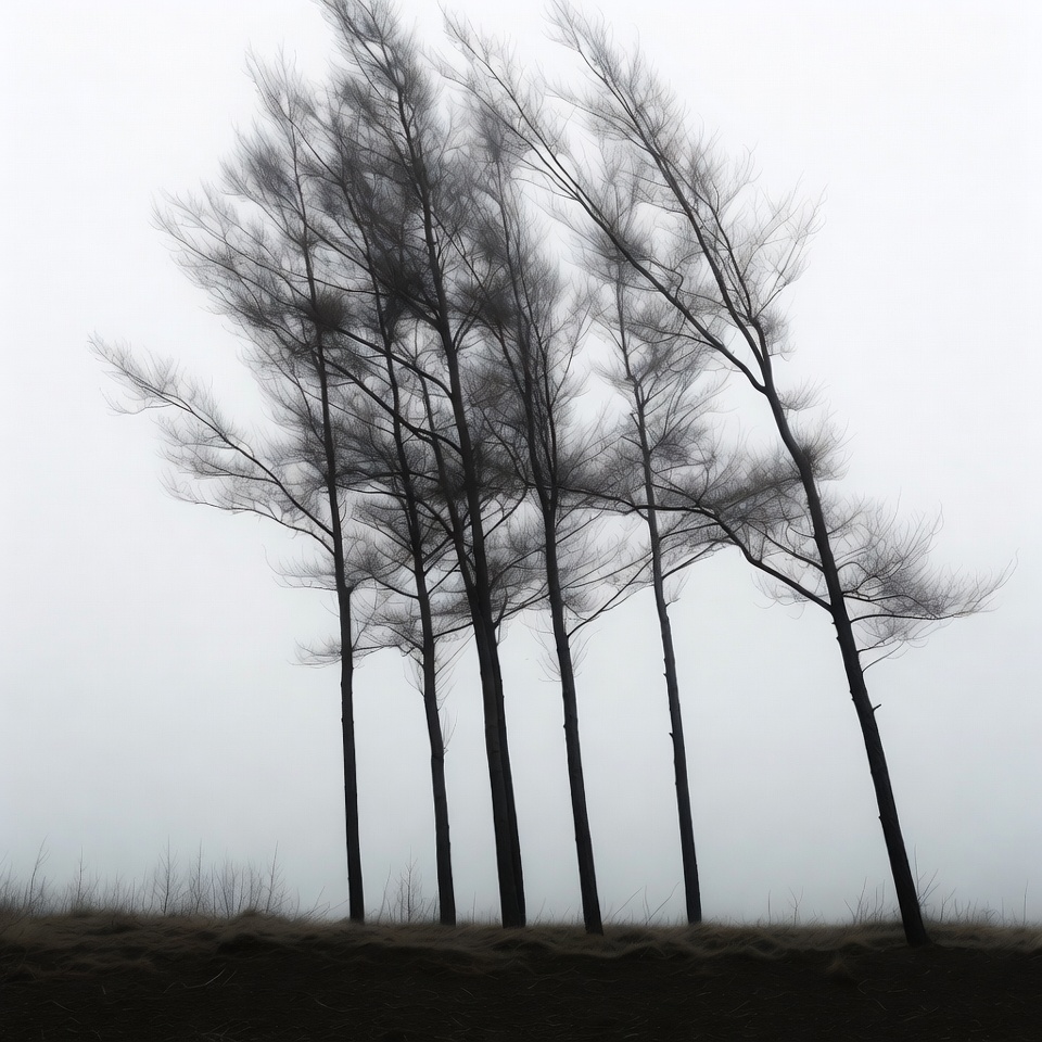 black and white, fog, foggy landscape, grass hill, isolated background, landscape, mist, monochrome, motion blur, nature, outdoor, silhouette trees, tall trees, trees bending, wind-swept trees, windy weather, casuarina trees