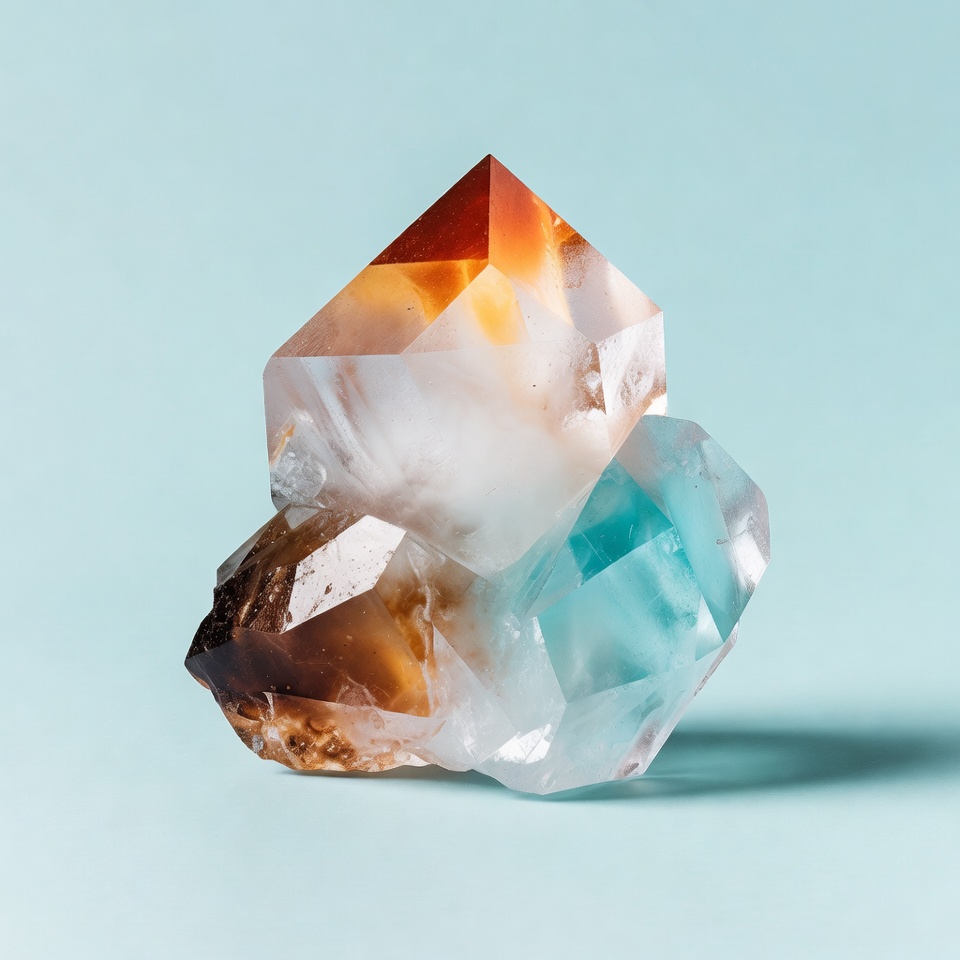 clear quartz, colorful quartz, crystal cluster, crystal formation, crystal healing, gem cluster, gemstone, isolated background, light blue background, mineral, multicolor gem, natural mineral, orange crystal, quartz point, raw crystal, rock crystal, sharp facets, transparent crystal, turquoise crystal, quartz crystal