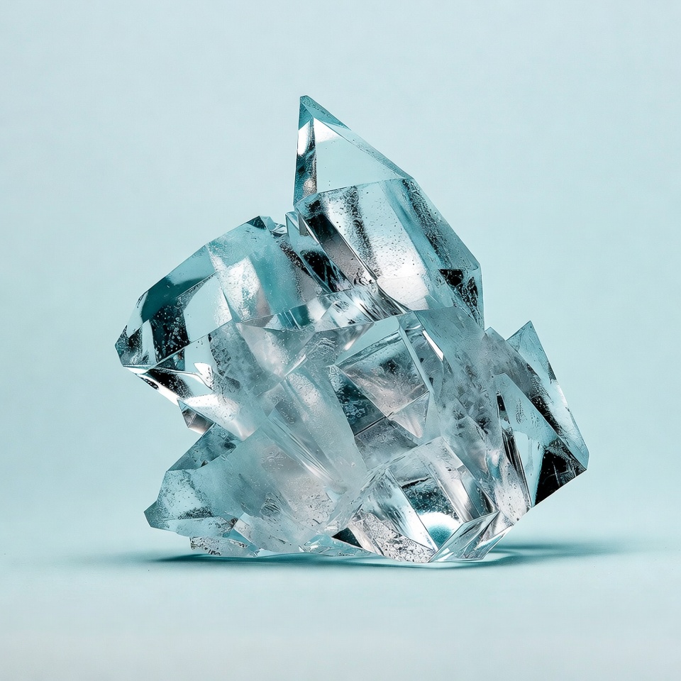 A large, translucent quartz crystal cluster features sharp, multifaceted points and geometric facets. It is positioned on a light blue background, showcasing its icy blue-white sheen and intricate structure. The crystal appears highly refractive with visible internal clarity.