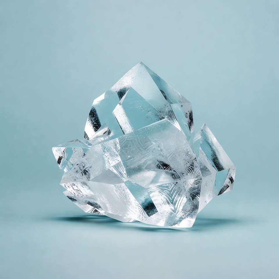 A large, transparent quartz crystal cluster features multiple faceted points and geometric faces. It is centered against a smooth light blue background, isolated for clarity. The crystal's refractive surfaces create subtle internal patterns and shine.