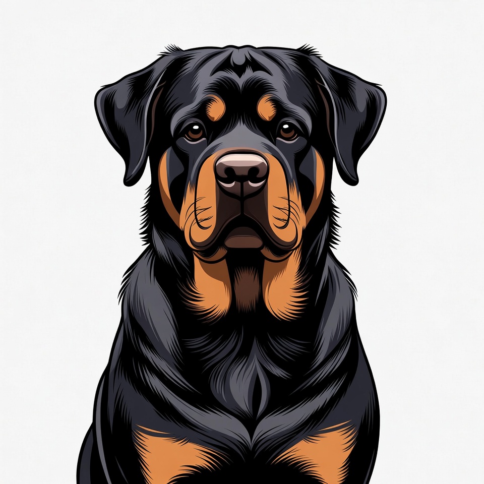 A detailed vector illustration of a Rottweiler dog facing forward on a white background. The dog has black fur with tan markings on its muzzle, chest, and legs, and expressive brown eyes. Its head and upper body are prominently featured in a realistic style.