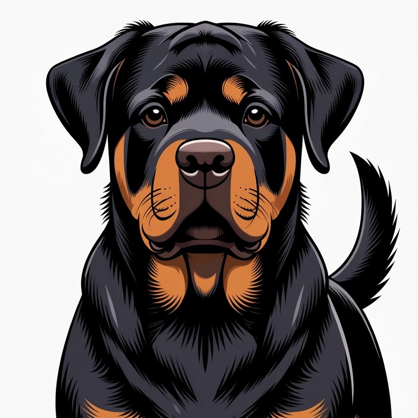 German breed, alert eyes, animal portrait, black fur, breed, canine, clipart, curled tail, dog, fierce dog, floppy ears, illustration, isolated background, loyal pet, muscular dog, pet, tan markings, vector art, Rottweiler