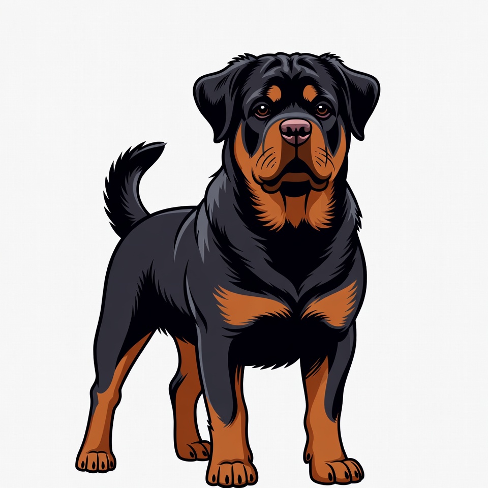 A detailed vector illustration of a Rottweiler dog standing on a white background. The dog has a muscular black and tan body, perked ears, and a curly tail. It faces forward with a serious expression.