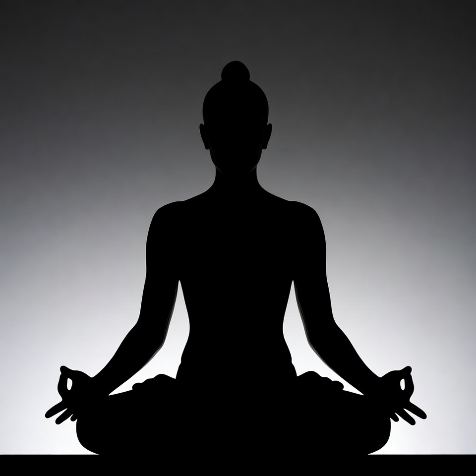 A black silhouette of a woman sits in the lotus yoga position with hands in prayer pose. She has a bun hairstyle and faces forward against a light gray gradient background. The image emphasizes her serene seated posture on a flat surface.