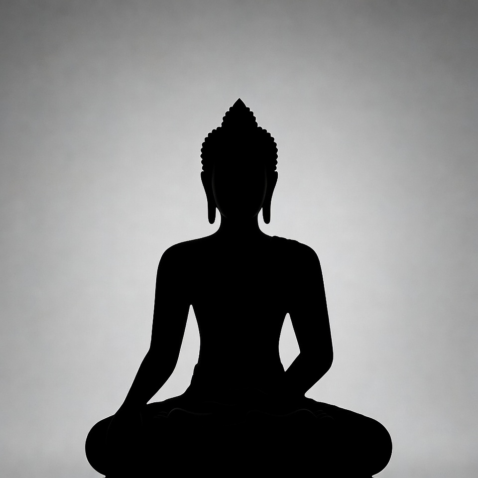 A black silhouette of Buddha sits in a meditative lotus position against a light gray background. The figure features traditional robes, a topknot on the head, and hands resting in the lap. The isolated outline emphasizes serenity and spiritual posture.