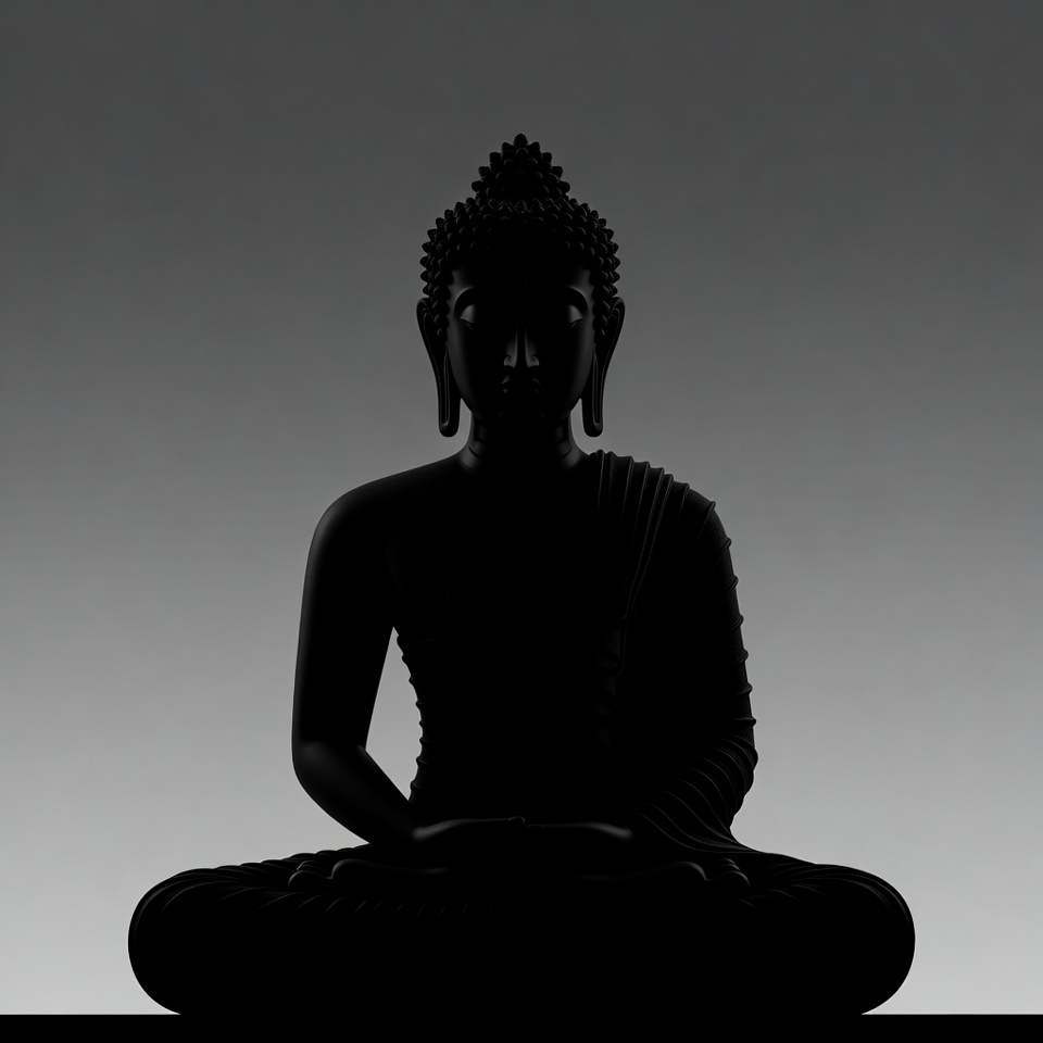 A black silhouette of a Buddha statue sits in a meditative lotus position against a gray gradient background. The statue features traditional robes draped over the body and a prominent topknot on the head. Fine details are visible in the facial features and folded hands.