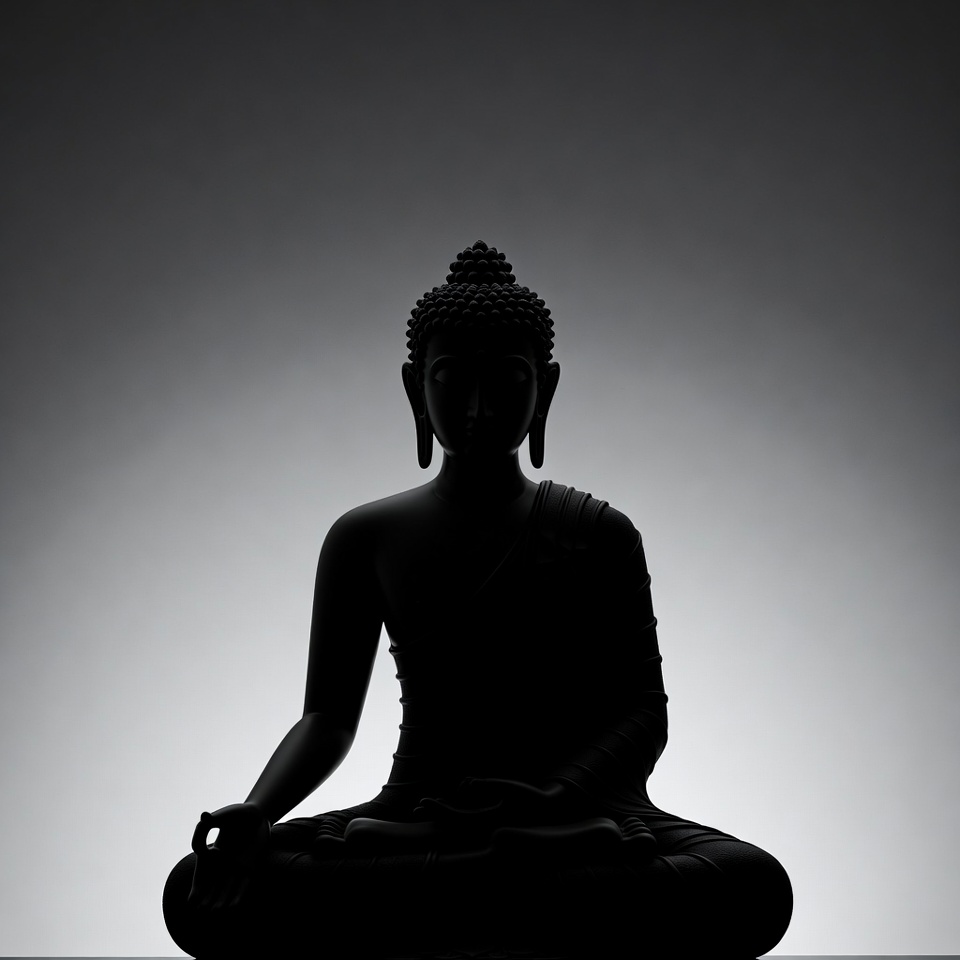 A black silhouette statue of Buddha sits in a meditative lotus position against a light gray gradient background. The figure features traditional robes draped over the body, hands in a mudra gesture, and a topknot on the head. The image creates a striking contrast with sharp outlines and soft shadows.