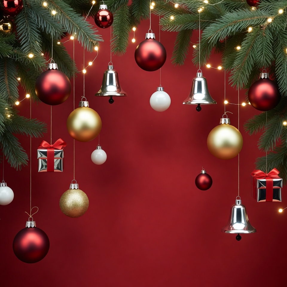 Christmas baubles, Christmas decor, Christmas garland, Christmas lights, Christmas theme, Christmas tree branches, festive ornaments, fir branches, gift boxes, gold baubles, hanging baubles, holiday decorations, holiday wreath, isolated background, red background, red baubles, red gold white, shiny ornaments, silver bells, silver bells, twinkling lights, white baubles, wrapped gifts, Christmas ornaments