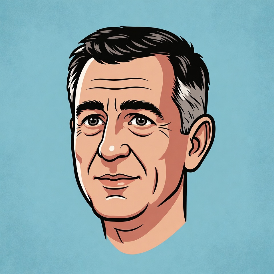 A stylized cartoon illustration of a middle-aged man with short dark hair graying at the temples and expressive eyes. He faces forward against a solid blue background. The artwork features bold outlines and flat colors typical of vector graphics.