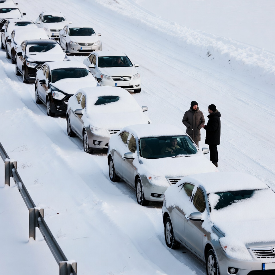 Two people in winter coats stand beside a line of snow-covered cars on a highway during a traffic jam. Snow blankets the road, vehicles, and roadside barriers. The scene is captured from an elevated angle overlooking the congested lane.