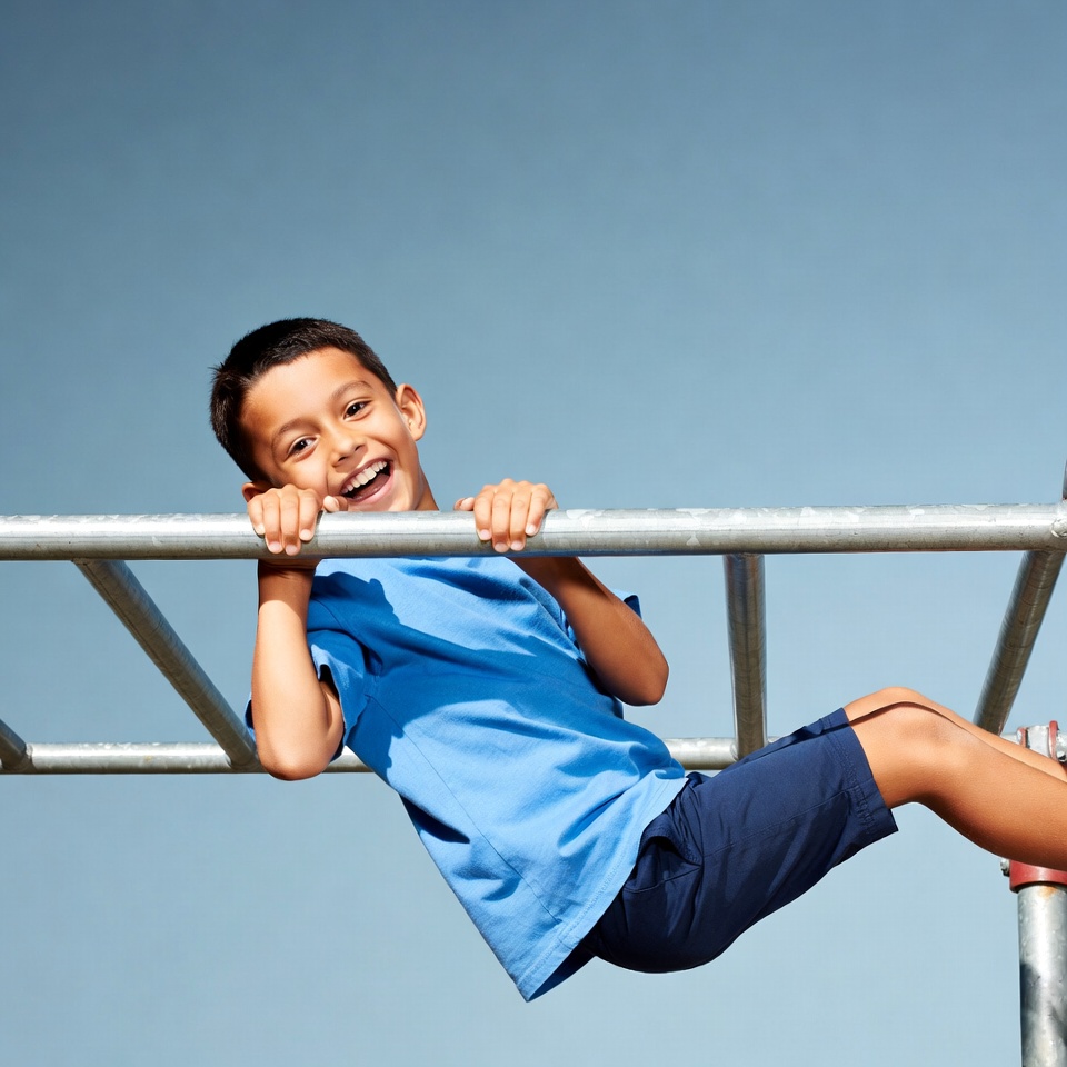 A young boy with short dark hair smiles widely while hanging sideways from monkey bars at a playground. He wears a blue t-shirt and navy shorts, gripping the metal bars with both hands. His legs dangle freely against a clear blue sky background.