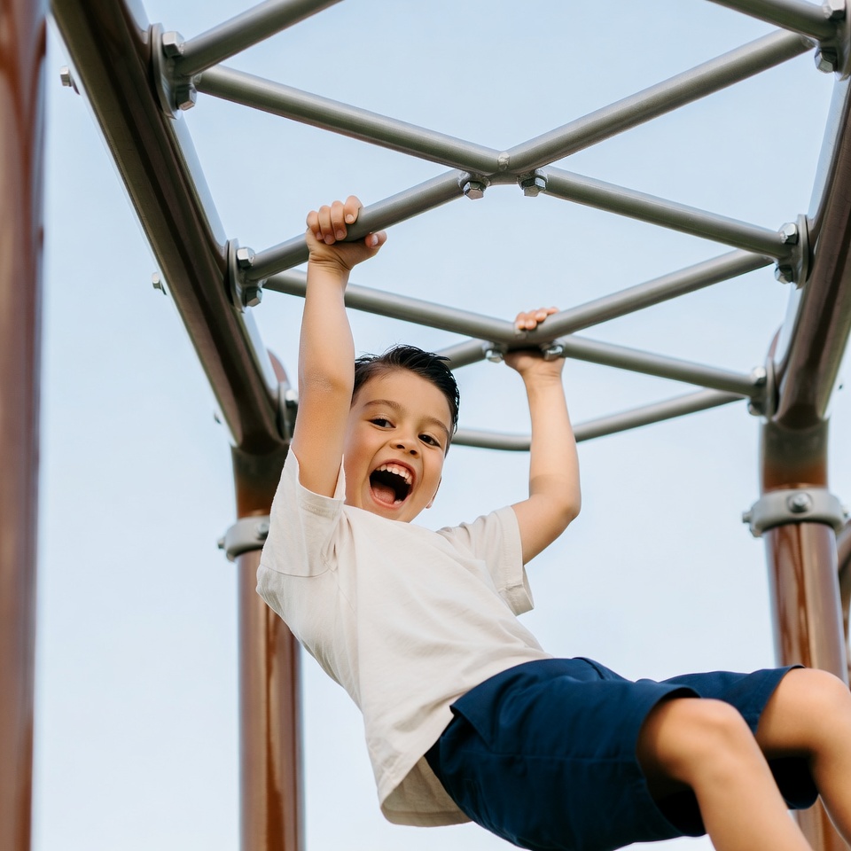 A young boy with short dark hair hangs from metal monkey bars at a playground. He wears a light short-sleeve shirt and navy shorts, smiling widely with an open mouth. The structure has brown posts and silver bars against a clear blue sky.