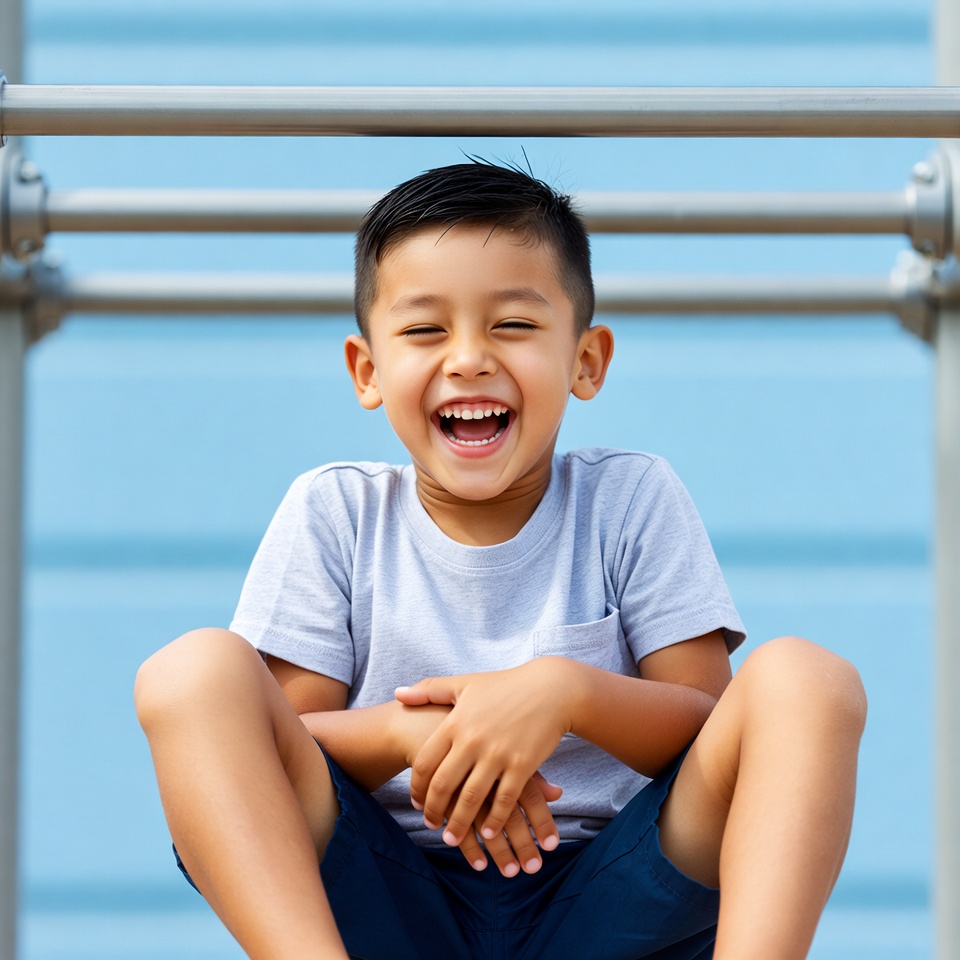 A young Asian boy with short black hair sits on metal playground bars against a blue background. He wears a gray t-shirt and navy shorts, grinning widely with squinted eyes. His hands clasp together in front as he squats happily.