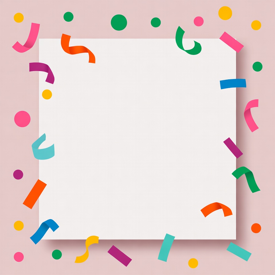 A white square sign with a blank center is surrounded by vibrant multicolored confetti dots and curling ribbons. The confetti includes shades of pink, yellow, green, blue, purple, orange, and cyan. The background is a soft pink with scattered festive elements.