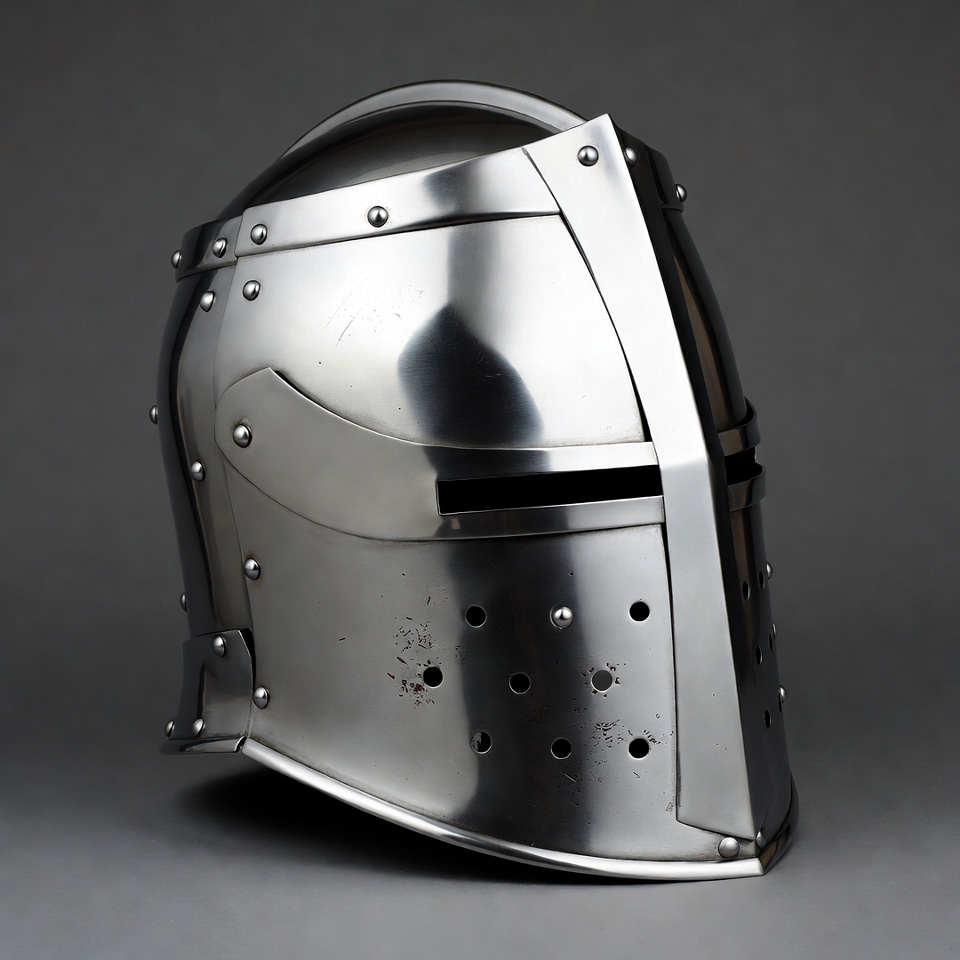 armor, battle helmet, cheek guards, crusader helmet, great helm, helmet, historical armor, isolated background, medieval helmet, metal armor, polished metal, rivets, rust spots, side view, silver helmet, steel helmet, ventilation holes, visor, warrior helmet, knight helmet