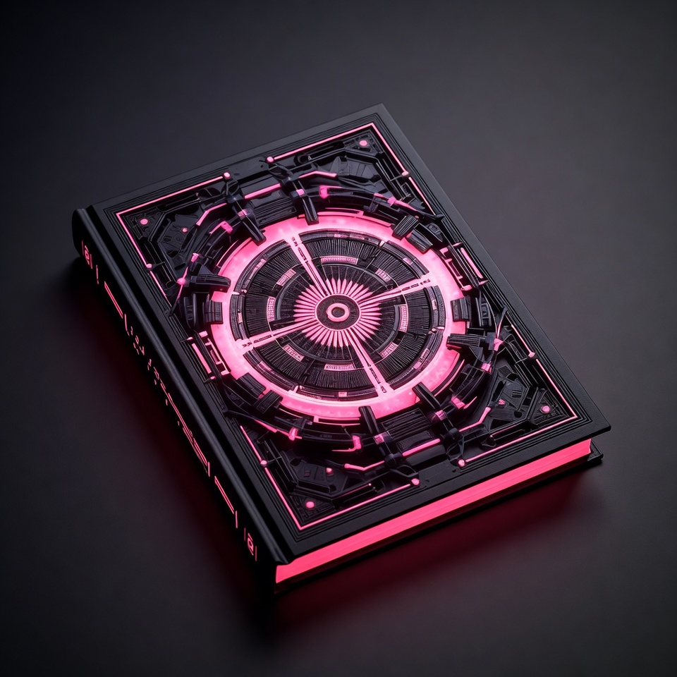 A 3D rendered cyberpunk book features a black cover with intricate mechanical designs and glowing pink neon accents. The central circular element emits a bright magenta light, surrounded by cybernetic patterns and edges. It is presented against a dark isolated background.