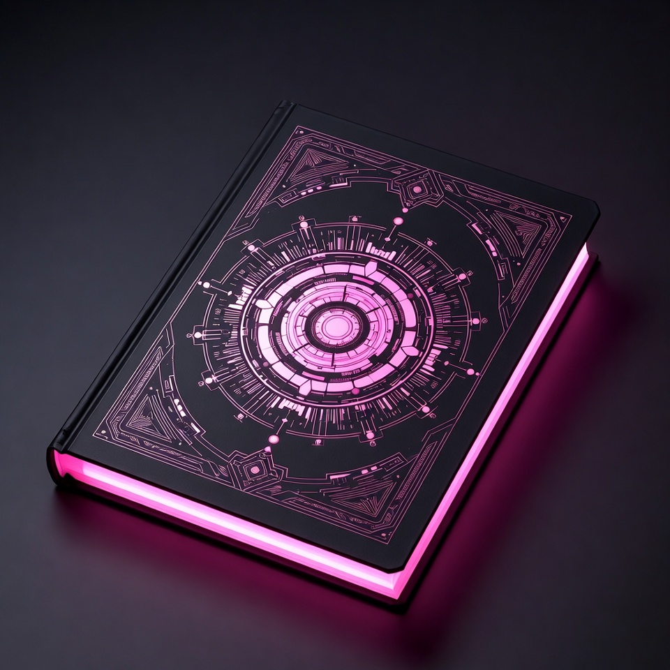3D render, black book, circuit design, cyberpunk book, digital art, futuristic book, geometric design, glowing book, hardcover book, illustration, isolated background, magical book, mandala pattern, neon book, ornate cover, pink glow, book