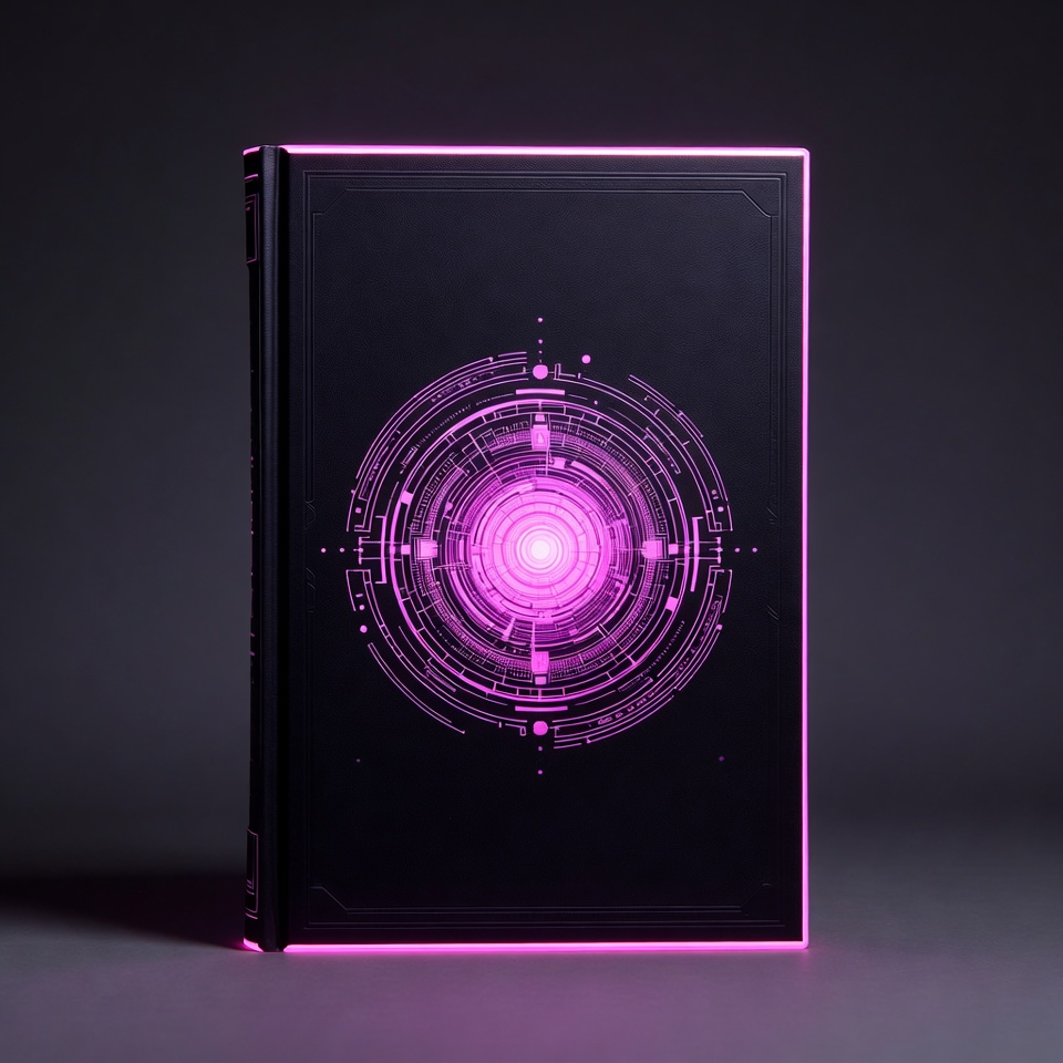 black book, book cover, circuit design, concentric circles, cybernetic design, dark background, digital art, futuristic book, glowing book, glowing edges, illustration, isolated background, neon purple, purple glow, sci-fi book, book