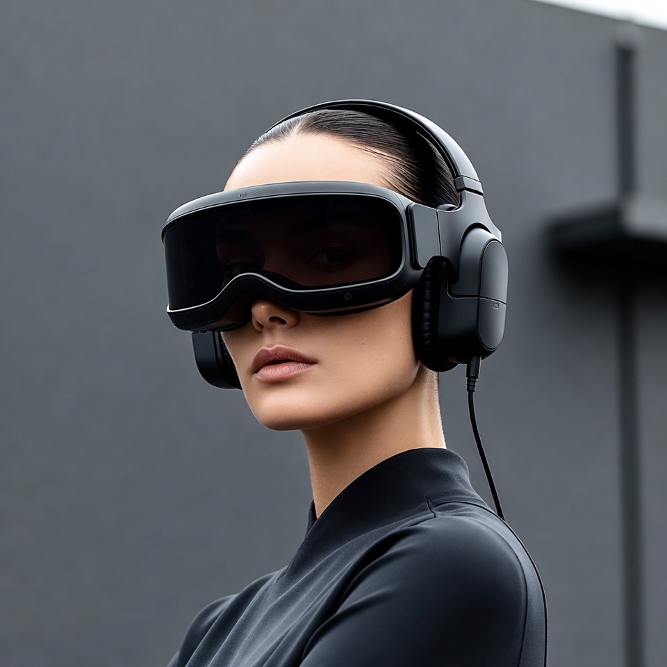 A woman with dark hair in a ponytail wears a black VR headset and headphones while standing against a gray background. She has a subtle expression with lips slightly parted and looks slightly to the side. She is dressed in a sleek black top.