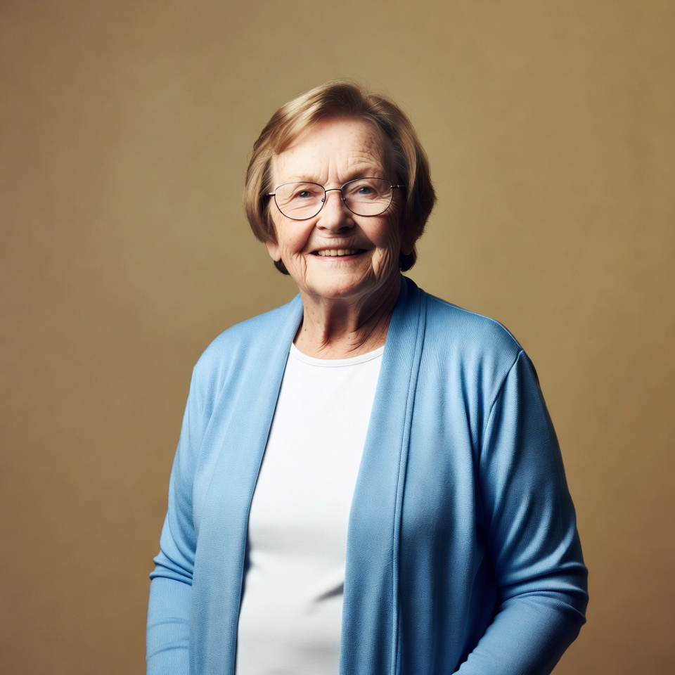 An elderly White woman with short blonde hair and glasses smiles warmly at the camera. She wears a light blue cardigan over a white top and stands against a beige background. Her expression is friendly and approachable.