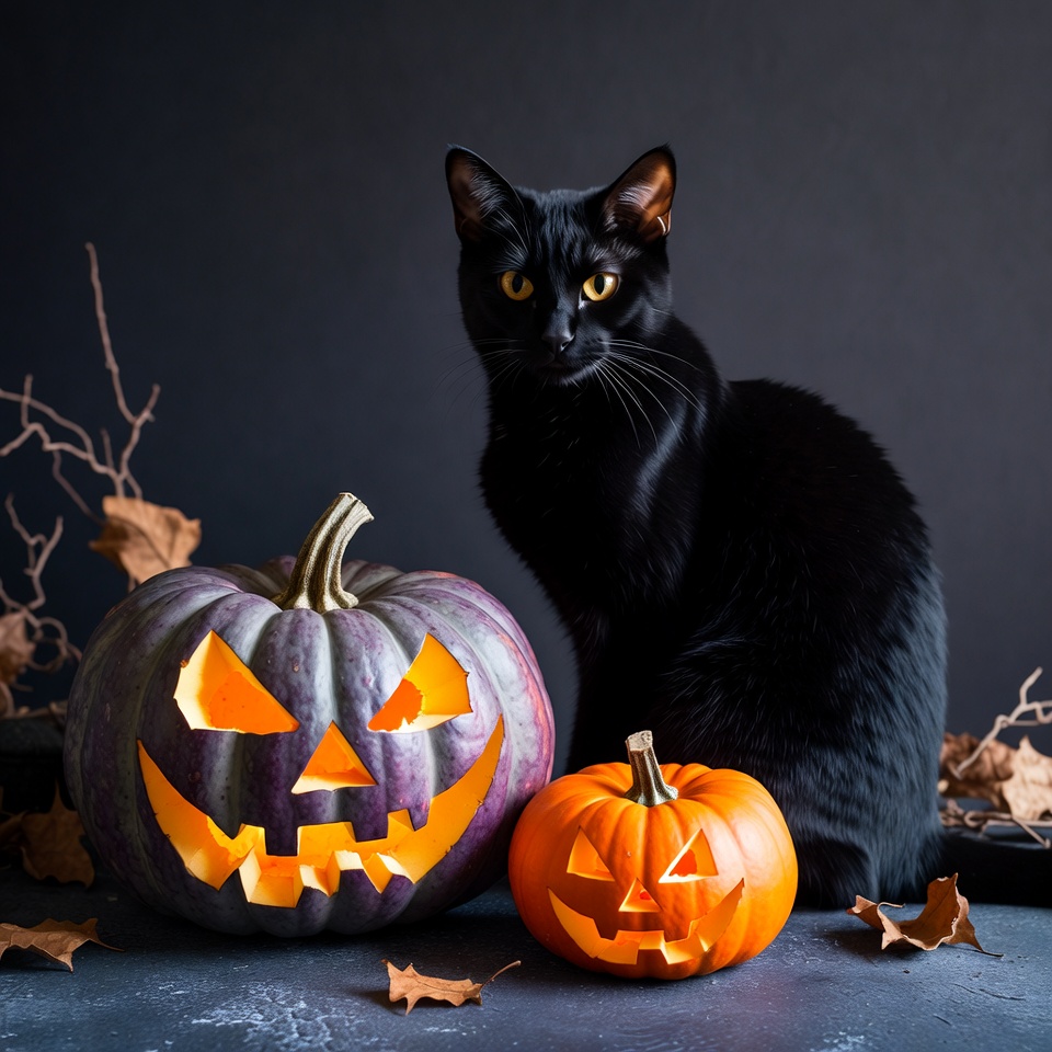 A black cat sits beside two carved jack-o-lantern pumpkins on a dark surface. The larger pumpkin features a purple hue with glowing orange eyes and jagged mouth, while the smaller one is classic orange. Scattered autumn leaves and branches add a Halloween atmosphere on a black background.