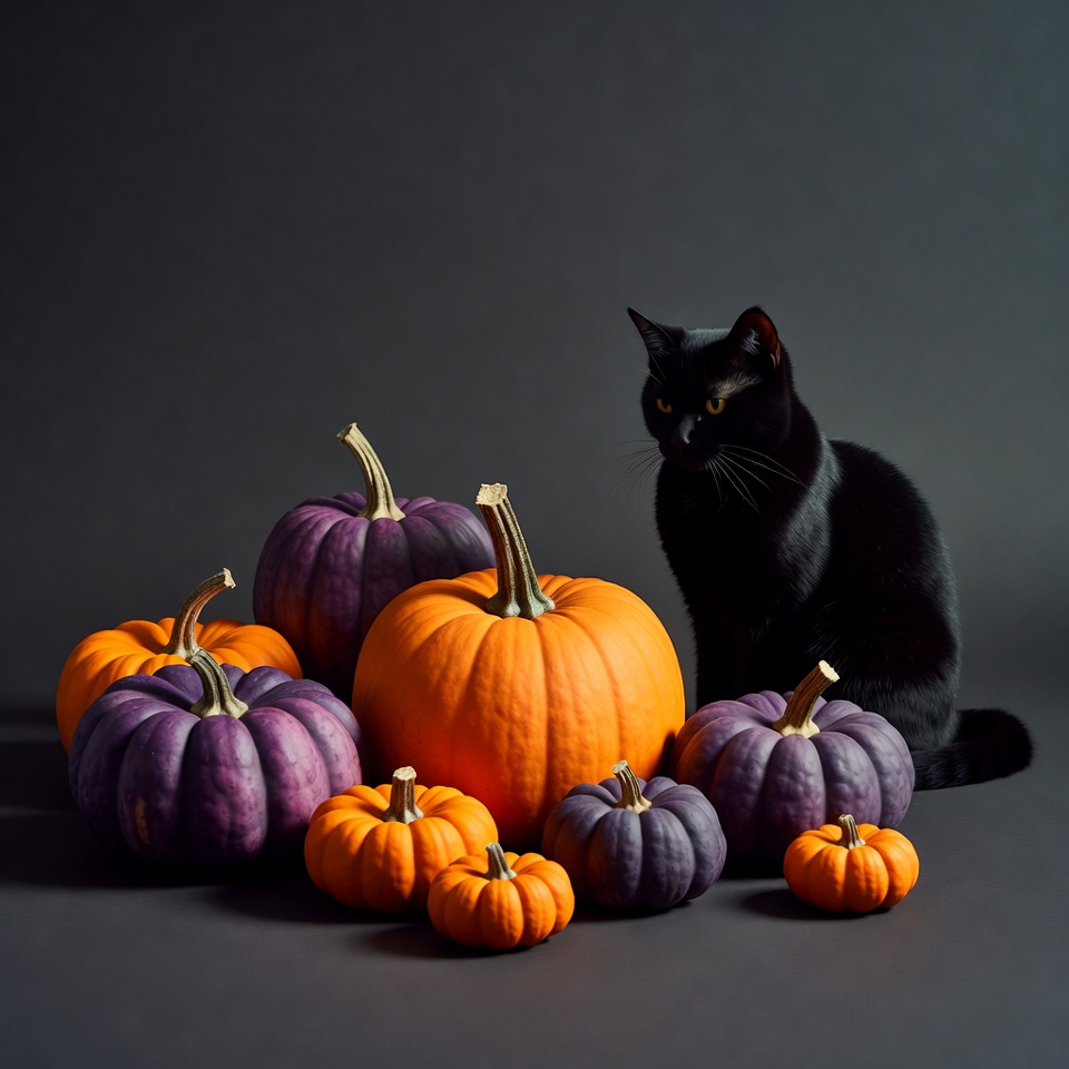 Black Cat with Orange Purple Pumpkins