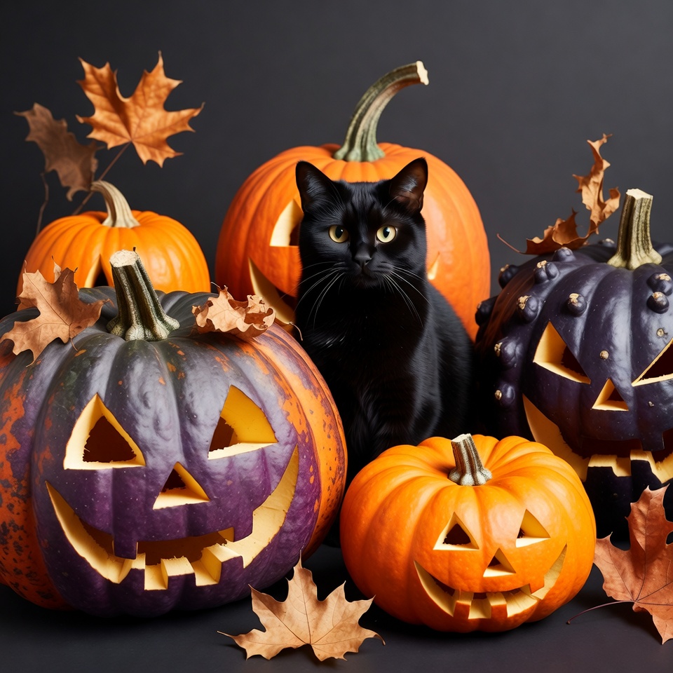 Halloween, Halloween decoration, animal, autumn leaves, carved pumpkins, cat, dark background, fall leaves, isolated background, jack-o-lanterns, orange pumpkins, pumpkins, purple pumpkins, spooky, black cat