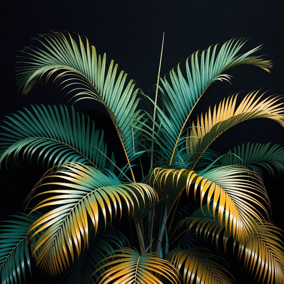 A cluster of palm fronds in shades of green and gold rises against a solid black background. The leaves feature long, feathery fronds with smooth gradients from teal green to bright yellow. The plant is centered and isolated for a striking visual effect.