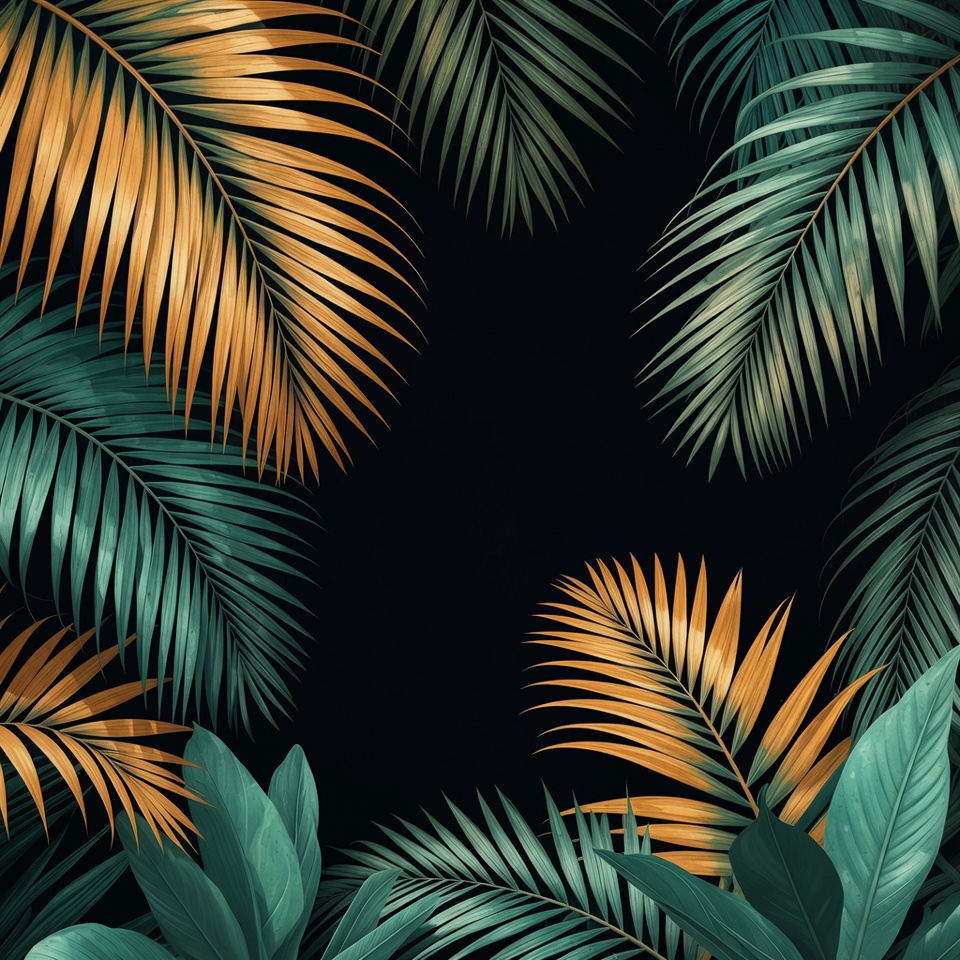 black background, botanical, dark background, exotic, foliage, fronds, golden leaves, green leaves, jungle, leaf arrangement, leaf cluster, nature, palm fronds, paradise leaves, plants, summer leaves, tropical foliage, tropical leaves, vibrant leaves, palm leaves