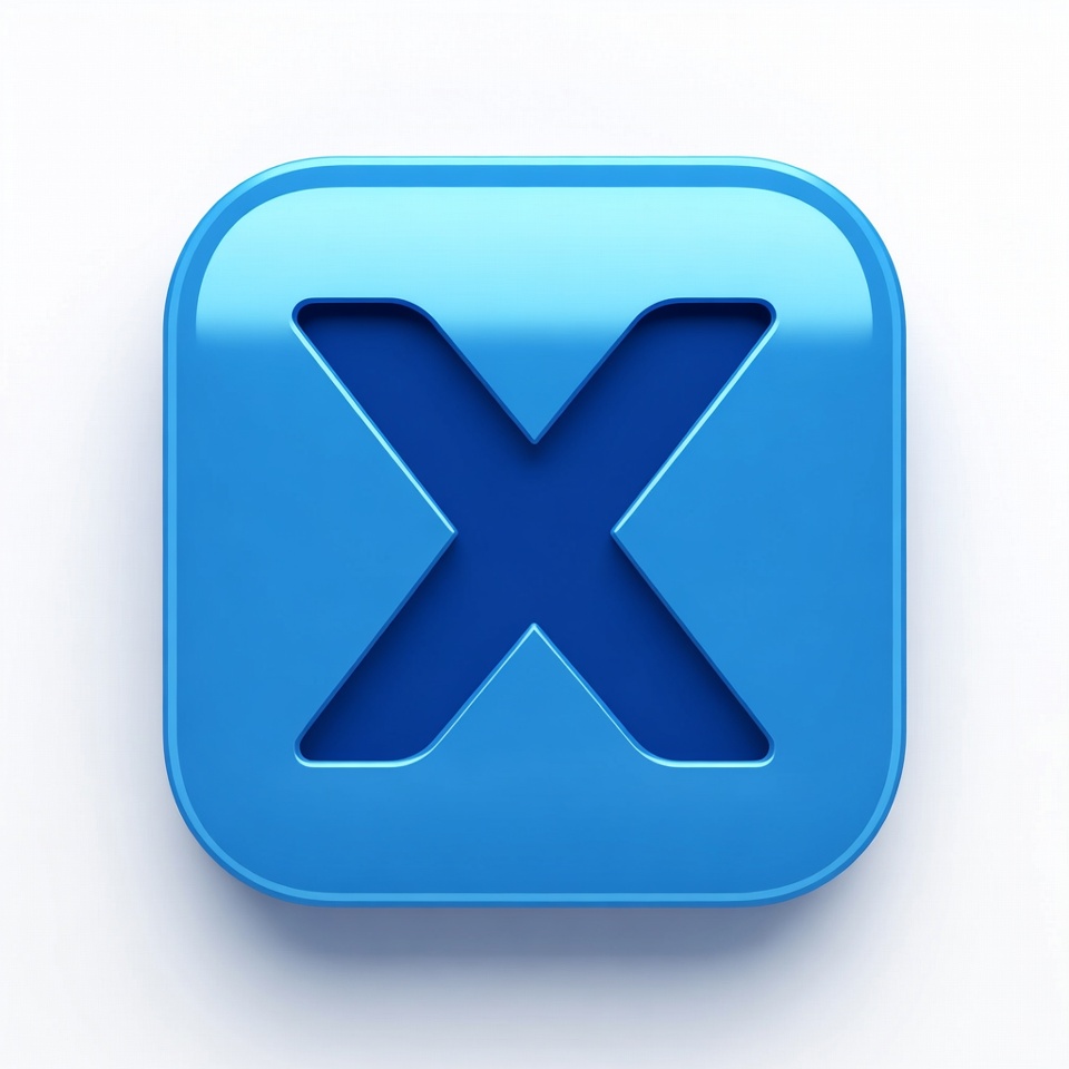 A glossy blue square icon features a bold white X cutout in the center. The design has a reflective metallic surface and is isolated on a white background. It appears as a 3D rendered digital symbol.