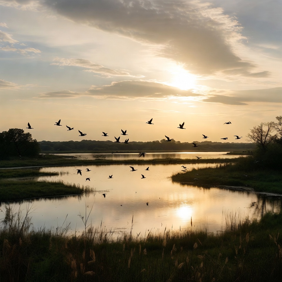 avian, clouds, evening, flock, flying, geese, golden hour, horizon, landscape, marsh, migration, nature, outdoors, peaceful, reeds, reflection, river, scenery, silhouettes, sky, sunlight, sunset, trees, water, wildlife, birds