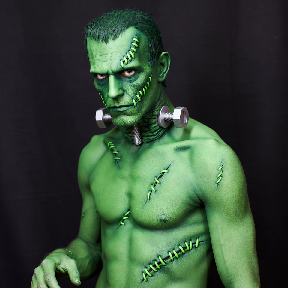 Halloween costume, White, black background, body paint, bolts, cosplay, ear bolts, green makeup, green skin, intense eyes, male, man, muscular, neck bolts, scars, shirtless, stitches, Frankenstein monster