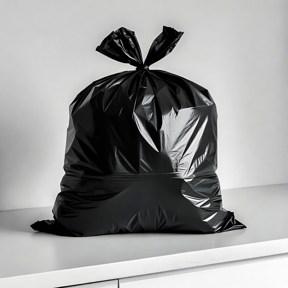 bin liner, black trash bag, garbage bag, glossy bag, household waste, isolated background, large bag, plastic bag, recycling bag, tied bag, waste bag, white table, trash bag