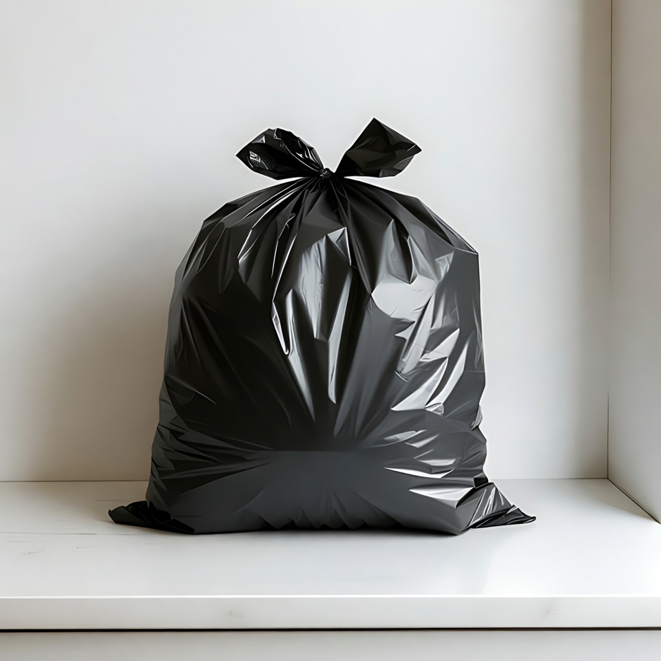 bin liner, black trash bag, disposal bag, full trash bag, garbage bag, glossy plastic, household waste, isolated background, plastic bag, recycling bag, tied bag, waste bag, white background, trash bag