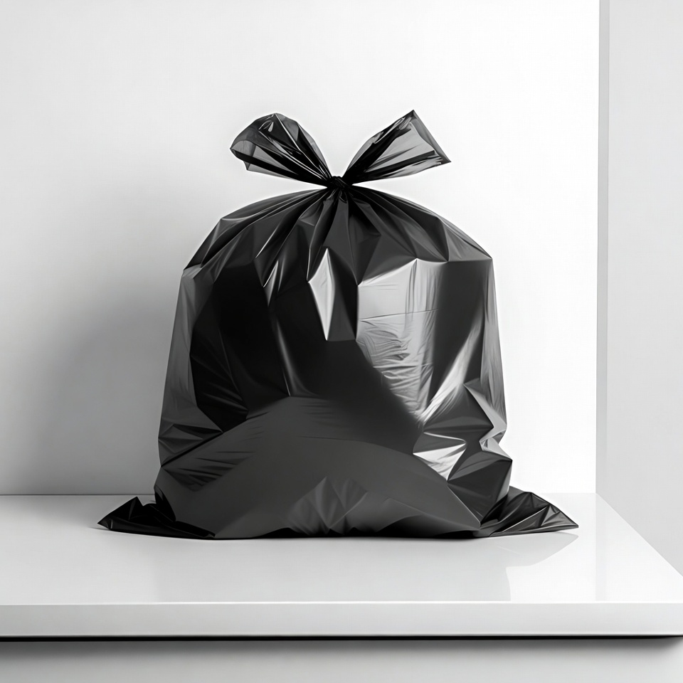 bin liner, black bag, black plastic, clean background, garbage bag, glossy plastic, high gloss, isolated, knotted top, plastic bag, refuse sack, shiny surface, simple object, standing bag, studio shot, tied bag, waste bag, white background, white table, trash bag
