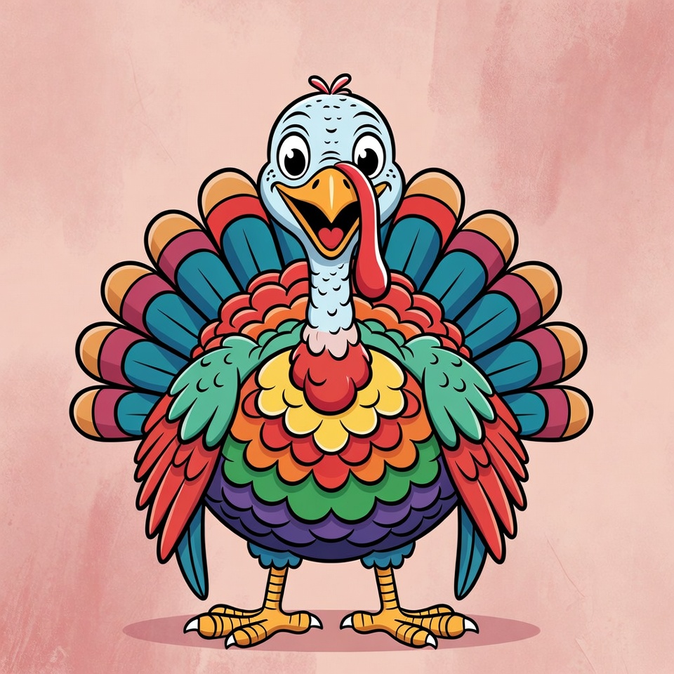 Cartoon Turkey with Rainbow Feathers