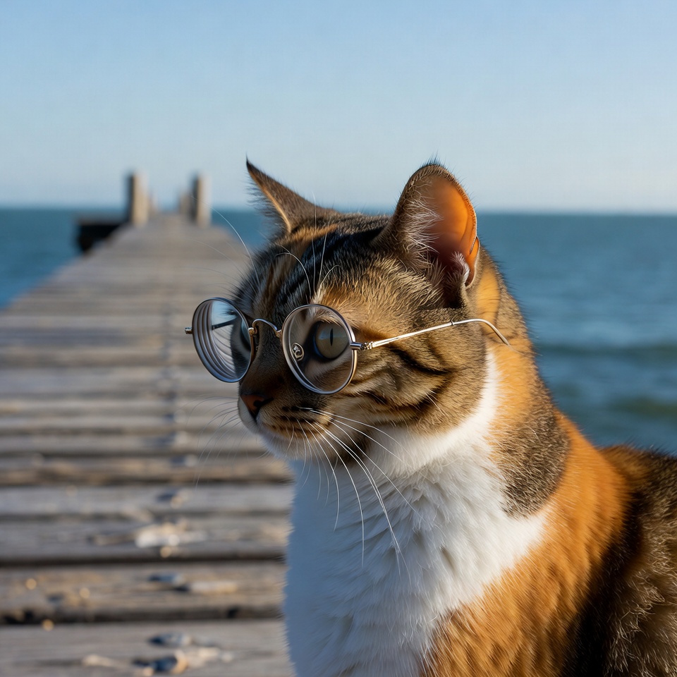 animal, beach pier, blue water, calico cat, dock, ears, glasses, lake pier, ocean, orange fur, outdoors, pet, pier, round glasses, sea, striped fur, sunny day, tabby cat, whiskers, white fur, wooden pier, cat