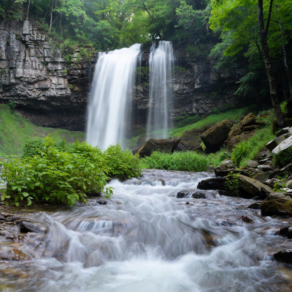 cascade, cliffside, double waterfall, environment, falls, foliage, forest, gorge, green forest, landscape, lush greenery, mossy rocks, natural beauty, nature, outdoors, rapids, river, rocky cliffs, scenic, stream, trees, vegetation, water flow, wilderness, woodland, waterfall