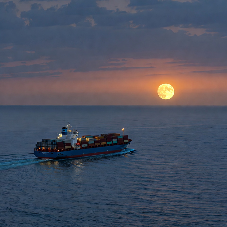 A large blue cargo ship loaded with colorful containers sails across calm ocean waters at dusk. A massive full moon rises on the horizon amid orange and purple sunset clouds. The ship's lights reflect on the water as it moves forward.