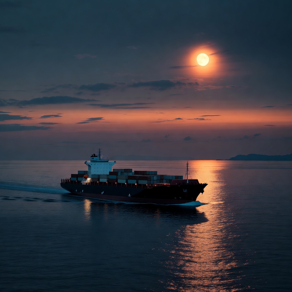 A large cargo ship loaded with colorful containers sails across calm ocean waters at dusk. A bright full moon rises in the cloudy sky above the vessel, with a vibrant orange sunset reflecting on the sea. The ship's wake trails behind as distant mountains silhouette on the horizon.