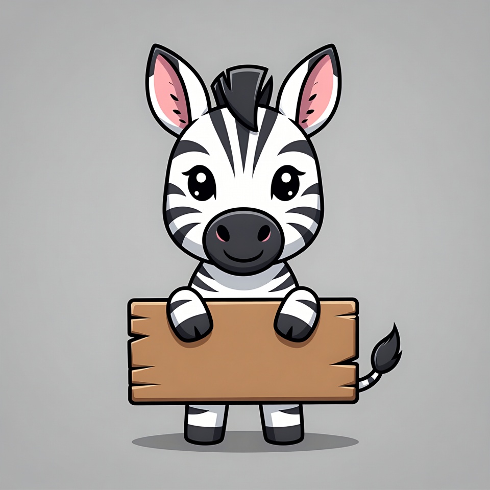 animal, baby zebra, big eyes, blank sign, cartoon zebra, chibi, clipart, cute zebra, gray background, holding sign, illustration, isolated background, kawaii, pink ears, smiling zebra, stripes, vector art, wooden sign, zebra