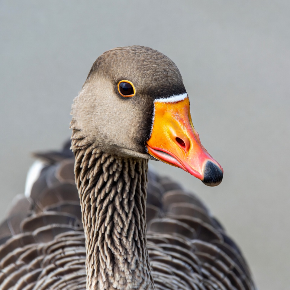 animal, bird, close-up, eye, feathers, goose, grey feathers, isolated background, neck, orange bill, portrait, waterfowl, white stripe, wildlife, greylag goose